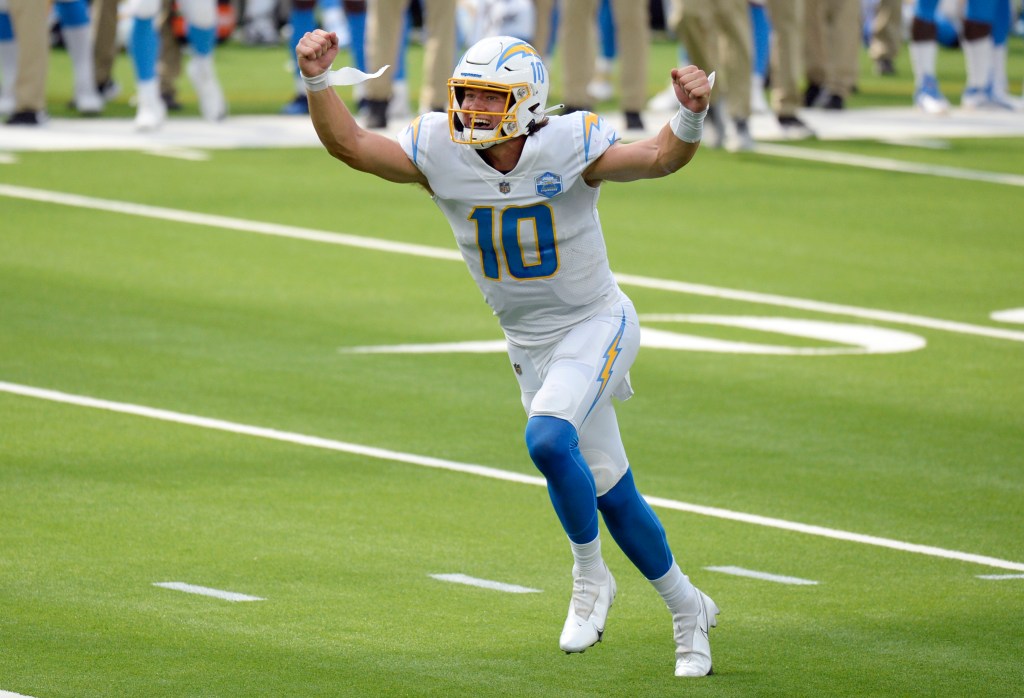Los Angeles Chargers quarterback Justin Herbert celebrates after throwing his first career touchdown pass during the first half of an NFL football game against the Kansas City Chiefs Sunday, Sept. 20, 2020, in Inglewood, Calif. (AP Photo/Kyusung Gong)
